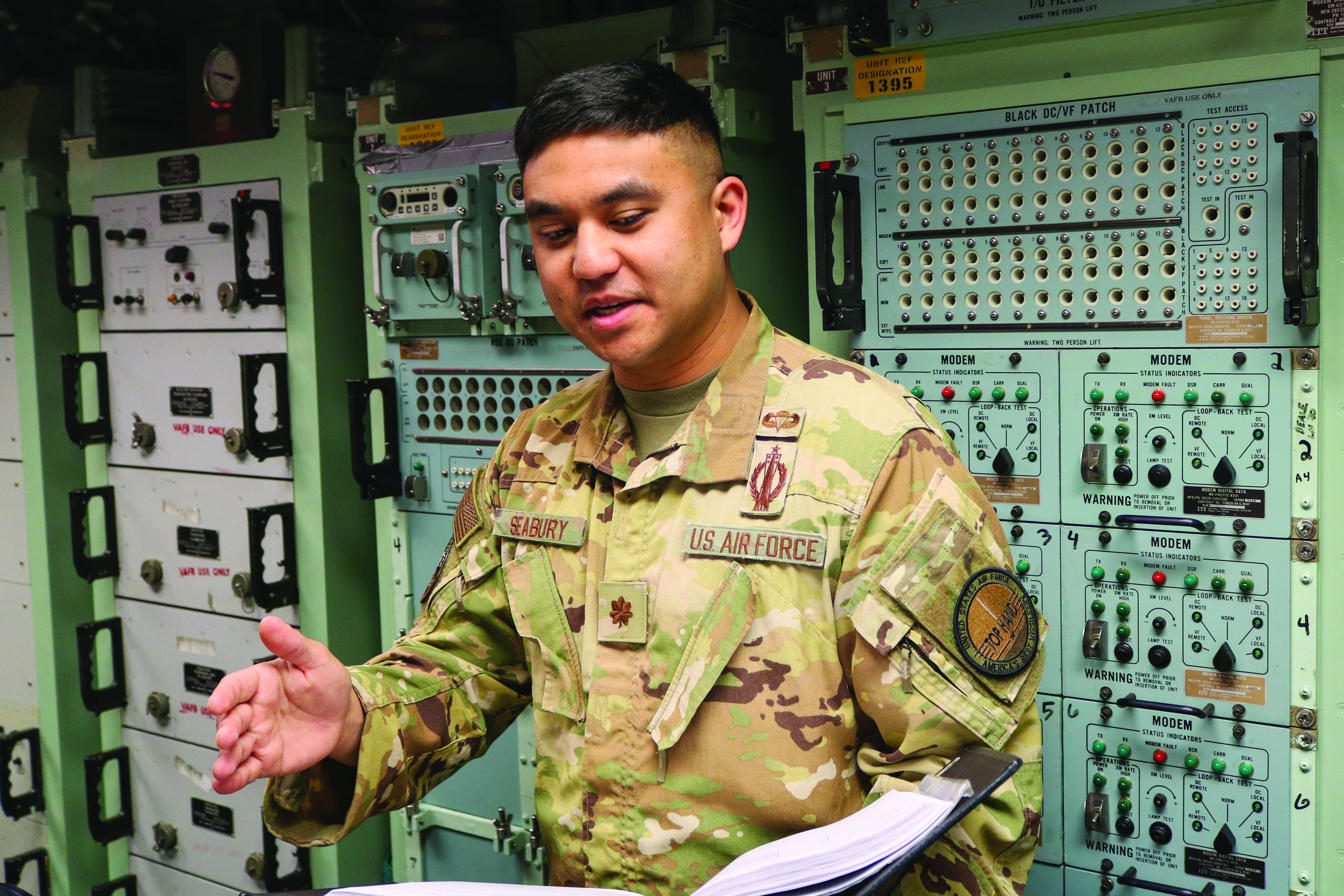 Beyond launches, Vandenberg serves as America’s premier aerospace testing range. The 377th Test and Evaluation Group — the only dedicated intercontinental ballistic missile test unit in the Department of War — validates the nuclear deterrent through end-to-end testing. “Our weapon system is utilized every single day to deter the adversaries of the United States and reassure our allies,” explains Maj. Jacob Seabury ’15, chief of ICBM Ground Test and Evaluation. “These test launches are routine and periodic, designed to demonstrate that our most responsive nuclear deterrent remains safe, secure, reliable and, most of all, effective.” Four times yearly, his team launches ICBMs to Kwajalein Atoll, 4,200 miles away. The weapon system components, as well as a contingent of operators and maintainers, travel from the operational ICBM wings to prepare and execute these flight tests. For safety, operational test launch sorties are capable of in-flight command-destruct to terminate the launch during the boosted phase of flight. While not present on operational ICBMs at the missile wings, this function reaffirms Vandenberg’s commitment to conduct operationally realistic, yet safe, operations. The juxtaposition between space-age operations and Cold War-era technology creates surreal moments. “Our operators in the Launch Control Center continue to use an integrated trackball to interact with the weapon system,” Seabury notes. “While many of our infrastructure systems continue to use some form of magneto-optical media, we are seeing a lot more modernization efforts.”