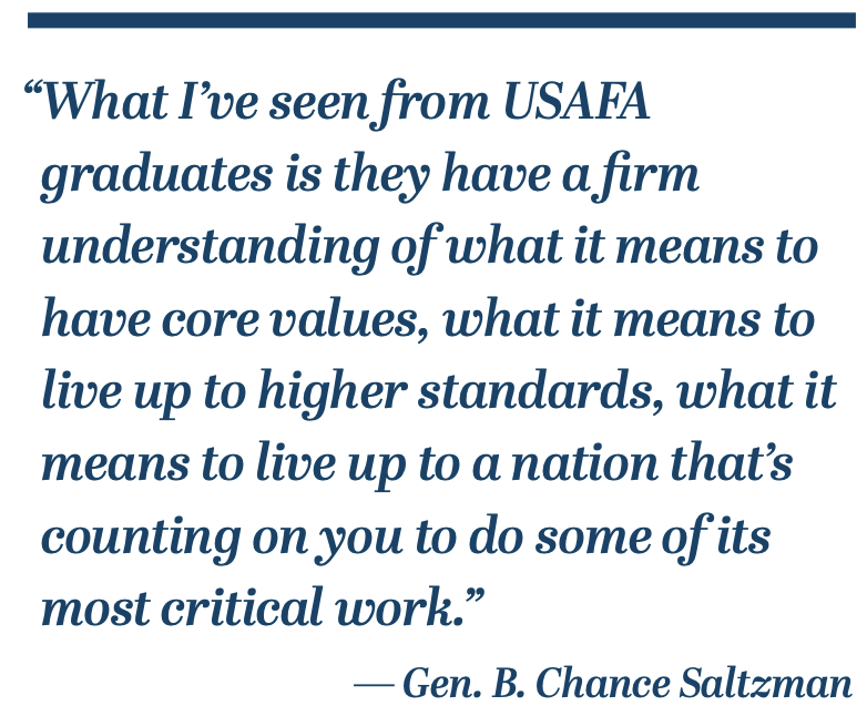 And so, what I’ve seen from USAFA graduates is they have a firm understanding of what it means to have core values, what it means to live up to higher standards, what it means to live up to a nation that’s counting on you to do some of its most critical work. And if you don’t have the character to follow through, if you don’t have the commitment to handle all the details, if you don’t connect to others and ask for help and try to learn as quickly as possible, and if you don’t have the courage to challenge your assumptions, the courage to kind of get outside of your comfort zone and discover what you could do, not just what you think you can do, you’re not going to be as successful. And I think what I’ve seen from the graduates, all of our new second lieutenants, is that they do have those values, and that they are ready on Day 1 to put them into effect and do the best they can for the Space Force.